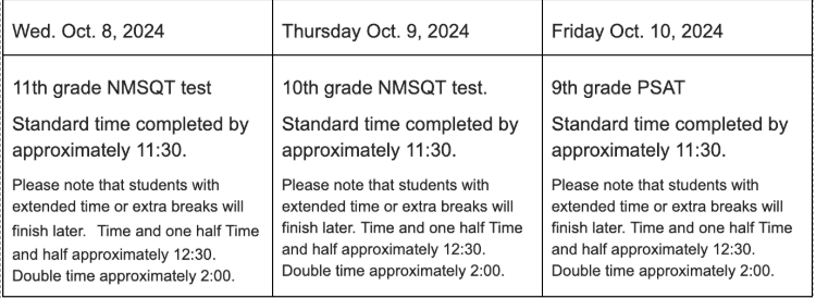 There will be one make-up opportunity for the 11th grade NMSQT test only starting at 8:20 a.m. on Tuesday October 14th in the library.