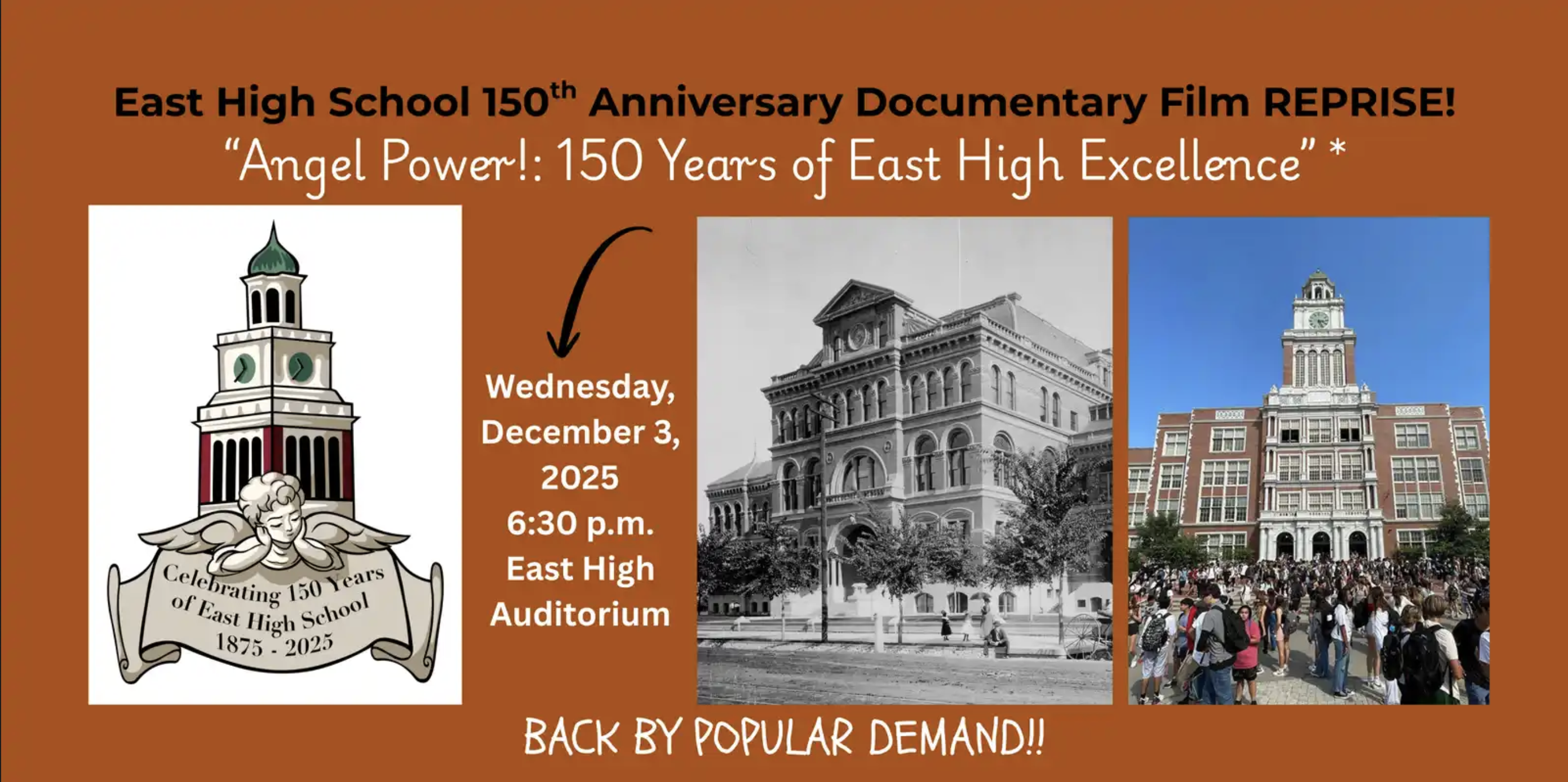 The day you’ve all been waiting for! Our East High School documentary “Angel Power!: 150 Years of East High Excellence” will be showing THIS Wednesday, December 3rd, at 6: 30 PM right here in the East auditorium for all to see. We are so excited to host this event and give the community the chance to get a look at all things East, from its beginnings dating back to the 19th century to today. If you are interested in attending, tickets can be purchased here: https://urldefense.com/v3/__https://events.humanitix.com/reprise-east-high-documentary-film__;!!I5wY4Ip2iQ-G!8jJBkfltD87laSY01sVwXbfw3kx1uIg_fAShAbOiXUMcOR2hZt5ASiQvWYZ2qxpKE8EU0eoqOKV4sxMNSIouBt8RHEu8$